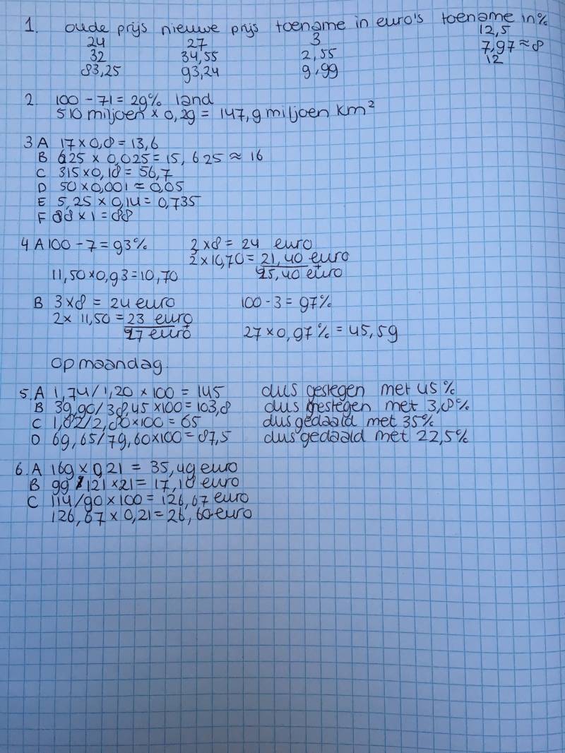 De leerlingen moeten de toename in procenten kunnen berekenen. Ik verwacht niet dat dit snel fout zou gaan, omdat de leerlingen dit al vaak hebben moeten doen. Ook moeten de leerlingen de nieuwe prijs kunnen berekenen aan de hand van de procentuele toenamen. Ik verwacht dat de leerlingen die minder inzicht op het gebied van procenten hebben hier eerder fouten zullen maken. Je moet begrijpen dat het nieuwe bedrag de 100 % + de 12% toename is. Dus in totaal 112%.