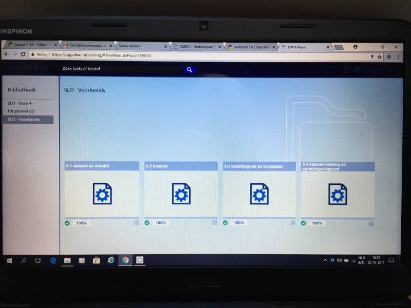 Opdracht 6B (kennen en kunnen) is opgaven maken op DWO. DWO staat voor digitale wiskunde omgeving. Ik vind DWO een goede manier om te oefenen met de lesstof. Ik zal het zelf niet gebruiken als vervanging van de normale opgaven. Doordat alles op de computer is, kan je niet oefenen met het tekenen van bijvoorbeeld een boxplot. In mijn les zou ik dit wel gebruiken als oefenopgaven voor een toets. De leerlingen kunnen er dan thuis aan werken en ook gelijk zien of het goed is. Wel had ik bij twee invulvelden dat DWO het antwoord niet goed keurde, terwijl ik vrij zeker ben dat het antwoord goed was. Dit zal ik ook meegeven aan mijn klas. Het is een goede manier om je kennis te controleren, maar ik vind het niet volledig genoeg, om alleen op DWO te vertrouwen. Ook is DWO goed in te zetten voor de leerlingen die eerder klaar zijn met hun huiswerk. De leerlingen om mijn stageschool hebben allemaal een laptop en kunnen dus heel gemakkelijk naar DWO gaan en daar extra oefenen. De leerlingen die extra uitdaging nodig hebben, kunnen opgaven maken van een niveau hoger. De leerlingen die juist eerst terug moeten naar de basis, kunnen de opgaven maken van een niveau lager.